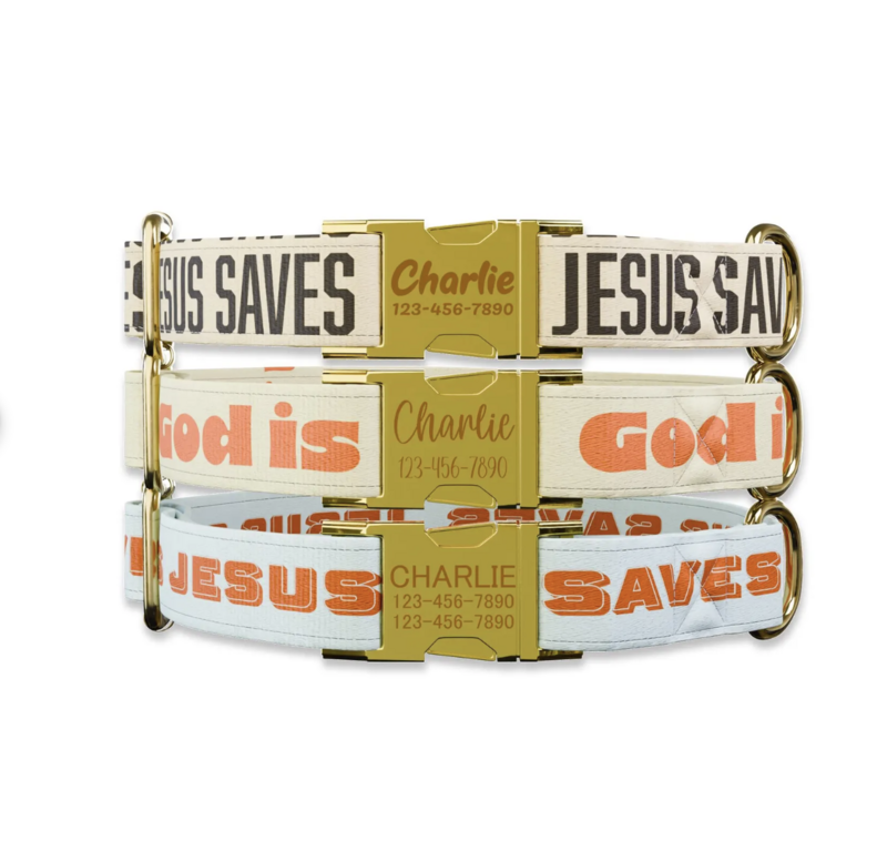Faith-based collars, leashes, and tags. that celebrate the special bond between you and your pup.